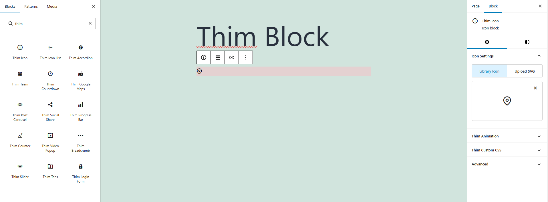 - Click on the Thim Icon block in the editor