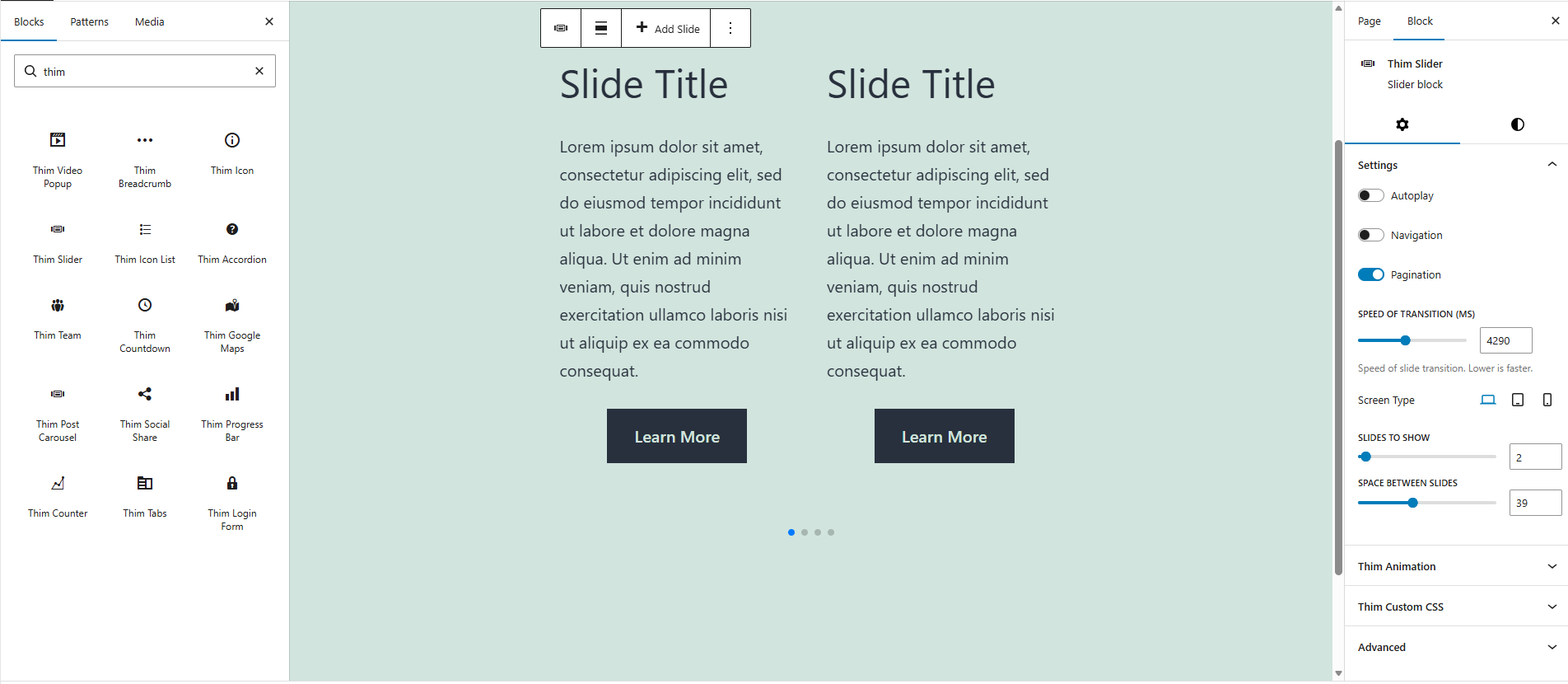 The Thim Slider Block allows you to create a responsive slider/carousel to display multiple items such as images, content blocks, or custom layouts.